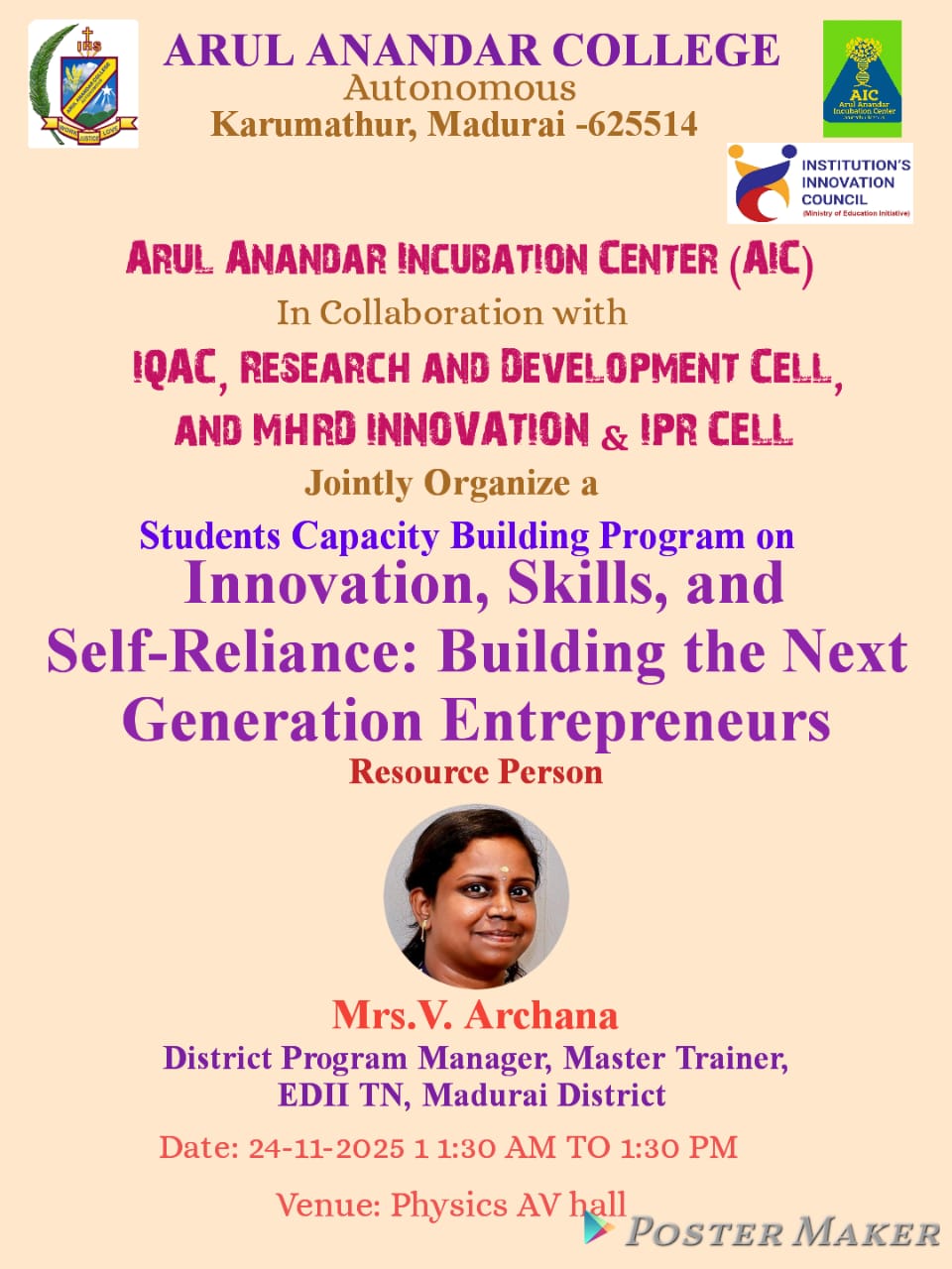 STUDENTS CAPACITY BUILDING PROGRAM ON INNOVATION, SKILLS, AND SELF-RELIANCE |   THE RESEARCH & DEVELOPMENT CELL OF AAC, ORGANIZES A VIRTUAL WORKSHOP ON HARNESSING AI TOOLS IN RESEARCH & EFFECTIVE LEARNER ENGAGEMENT ON 22 NOVEMBER 2025.  |   REVISED EXAMINATIONS MANUAL 2025-2026 |   DEPARTMENT OF ENGLISH(SF) - 8 DAYS ONLINE FDP (from 20.11.2025 to 28.11.2025) |   II-YEAR UG/PG SEATING ARRANAGEMENTS NOV-2025 |   I-YEAR UG/PG SEATING ARRANGEMENTS NOV-2025 |   VIRTUAL WORKSHOP ON INTERDISCIPLINARY RESEARCH DESIGN: ZEBRAFISH CASE STUDY IN DRUG DISCOVERY |   NOVEMBER 2025 SEMESTER ARREAR SEATING HALL ARRANGEMENT FROM 25-10-2025 TO 11-11-2025 |   INVIGILATION SCHEDULE-SEMESTER EXAMINATION NOVEMBER- 2025 |   SEMESTER HALL TICKET NOVEMBER-2025 |   ARREAR EXAMINATION TIME TABLE - NOVEMBER 2025 |   SEMESTER EXAMINATION TIME TABLE NOVEMBER 2025 |   SEMESTER EXAMINATIONS FEE DETAILS-NOVEMBER 2025 |   SEED MONEY PROJECT PROPOSAL FORMAT (2025-26) |   EVEN SEMESTER INTERNAL IMPROVEMENT RESULT APRIL 2025 |   EVEN SEMESTER PRIVATE ARREAR RESULT APRIL 2025 |   PROSPECTUS 2024-2025 |